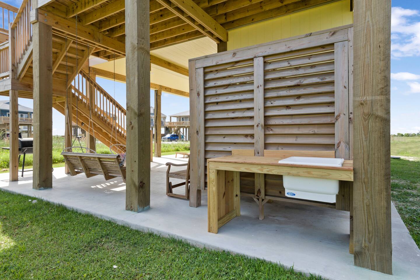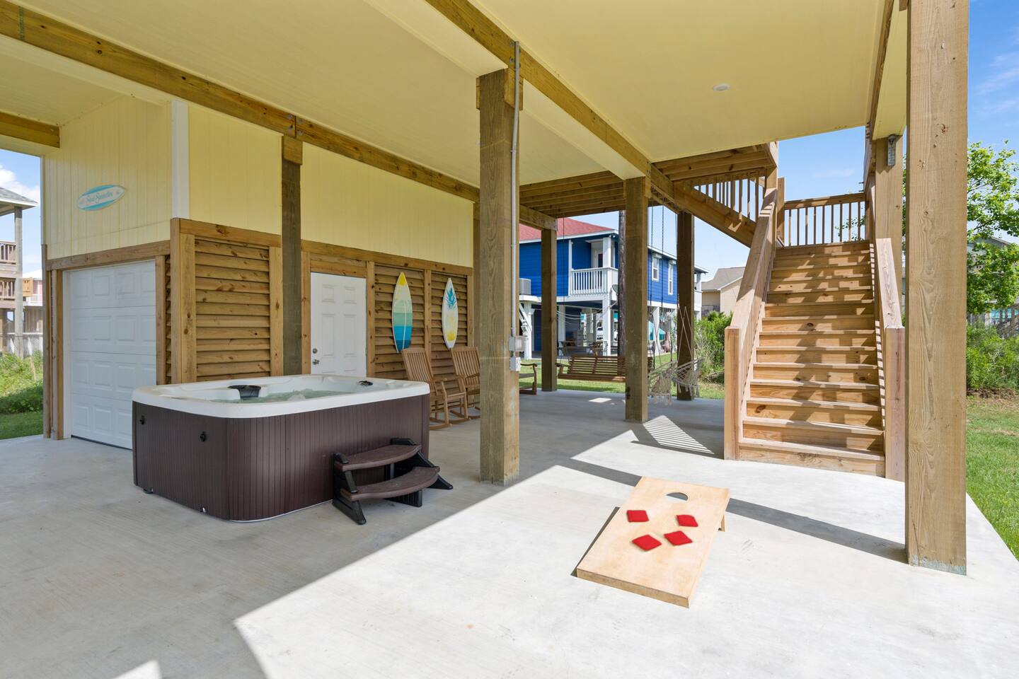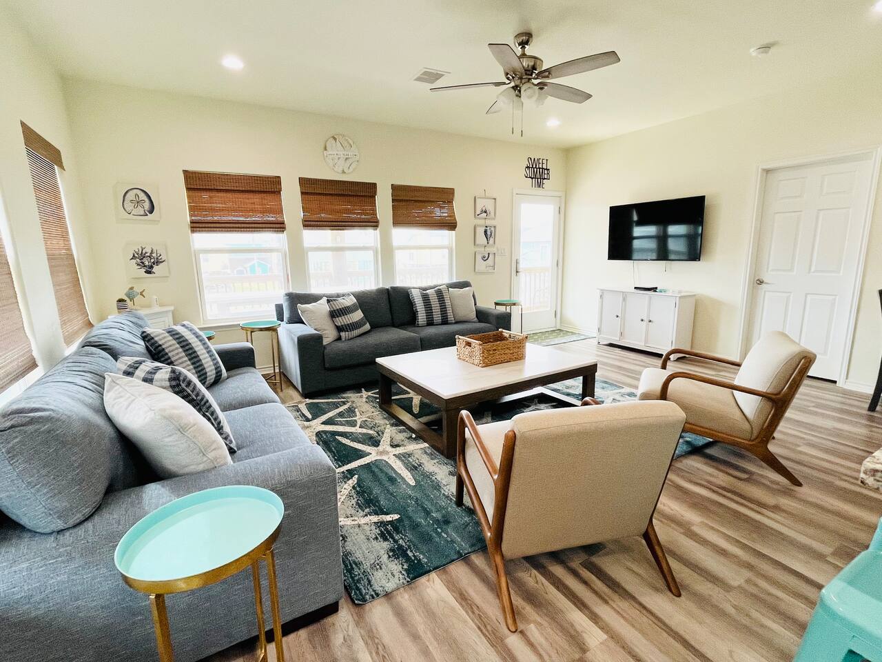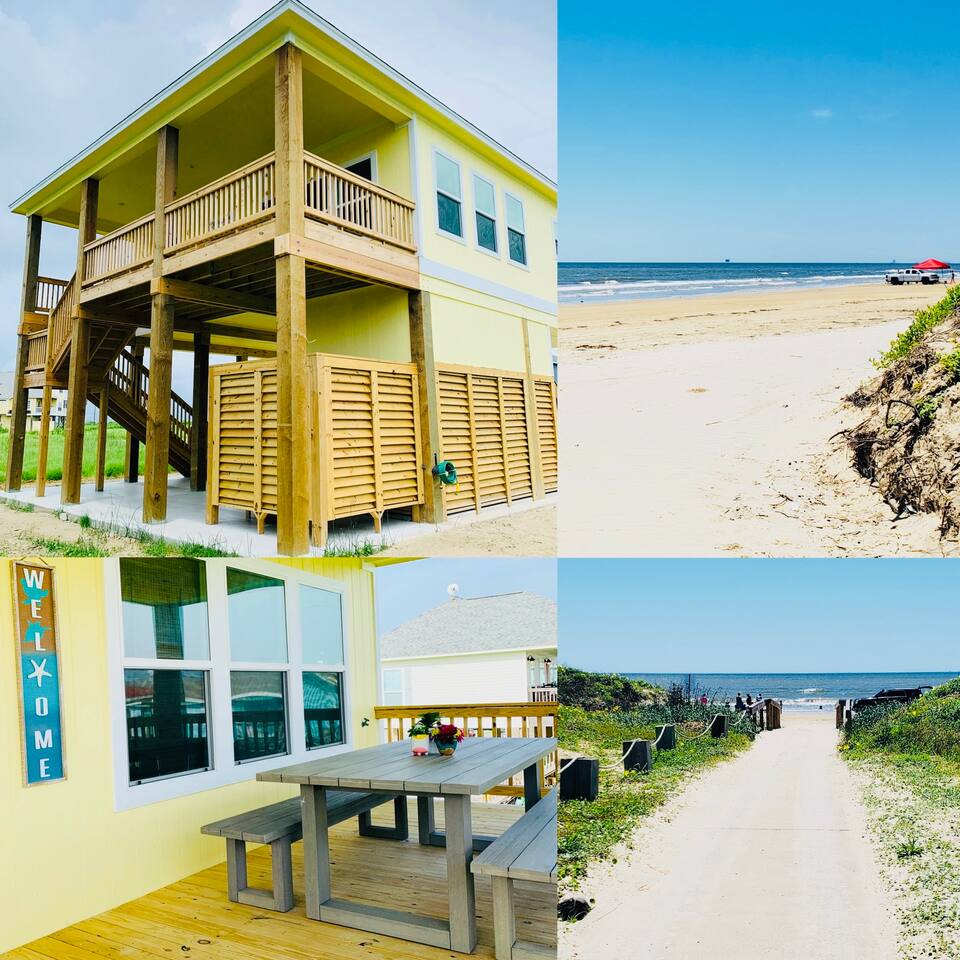 “Sweet Summertime” is a newly built (June 2021) 3/2 beachside bungalow in the Lafitte’s Landing subdivision in Crystal Beach. Private community beach access is a quick 5 minute walk from the house. Bring your golf cart or rent one and use the cart path to drive right onto the beach! 3 king bedrooms make this home perfect for 3 couples or 1-2 families. Great outdoor space for entertaining with a hot tub, lots of seating, grill, fish cleaning station and an outdoor shower!