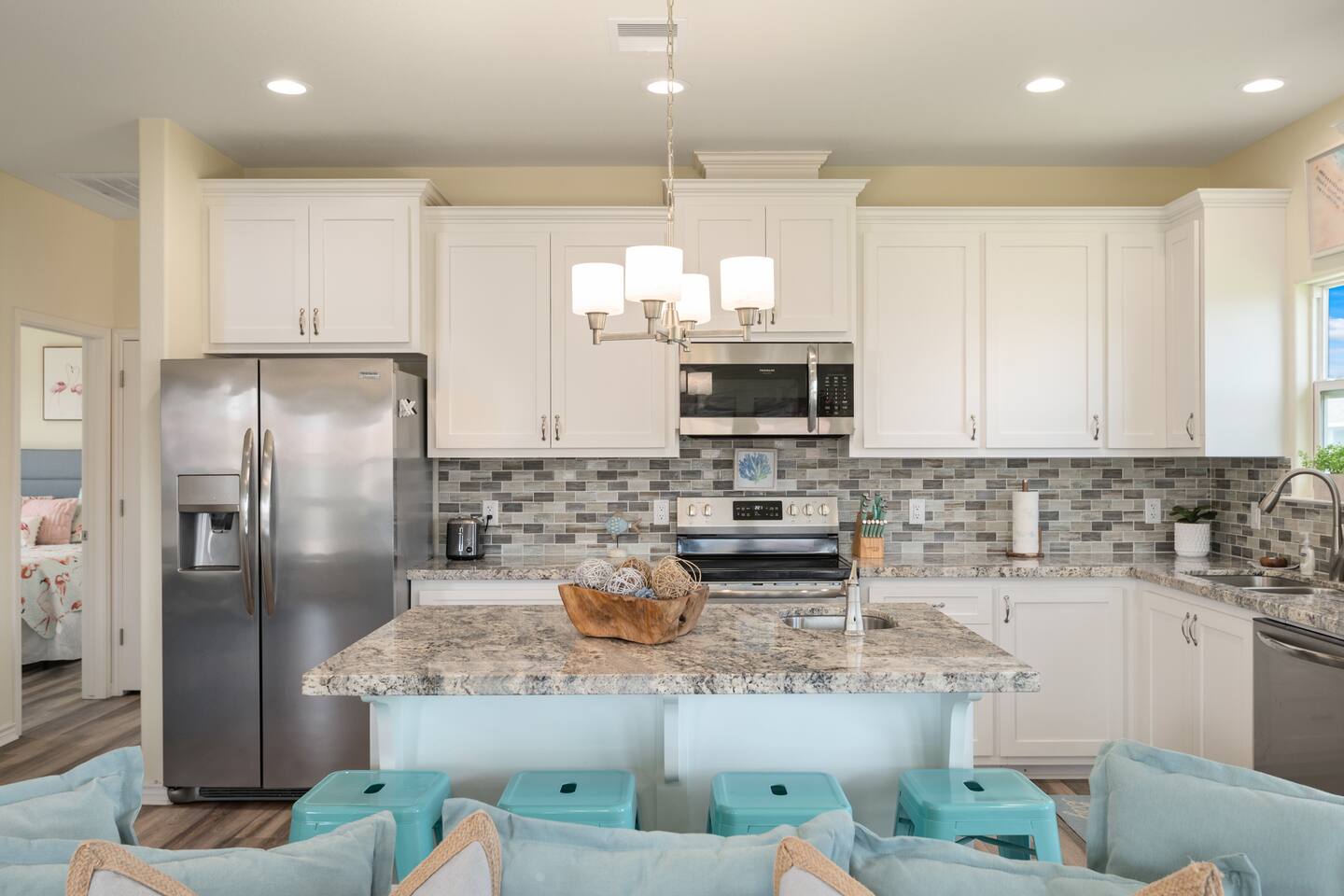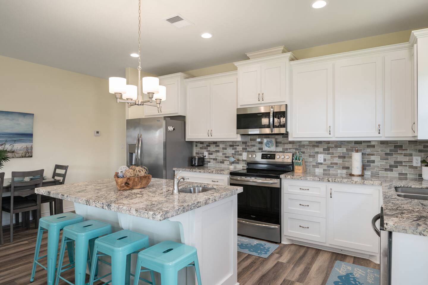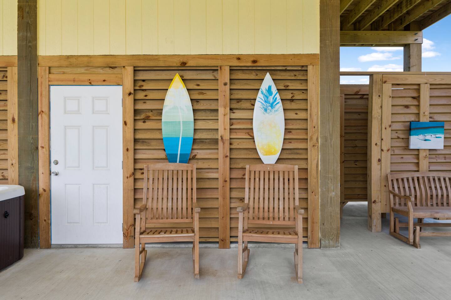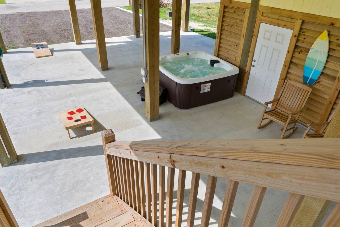 New home nicely appointed with comfortable king-sized beds in every room, a fully stocked kitchen, stackable washer/dryer, plenty of outdoor seating, outdoor shower and foot wash, 7 person HOT TUB, and all linens and towels included. Bedroom 1: King bed with en-suite bath Bedroom 2: King bed (shared bath) Bedroom 3: King bed (shared bath) Living Room: 2 Couches Sleeps 8 guests total Starlink high speed WiFi with smart TVs in each room. The large covered porch is a great space for outdoor dining or head under the house to entertain and listen to the waves. Plenty of parking in the driveway and under the house.
